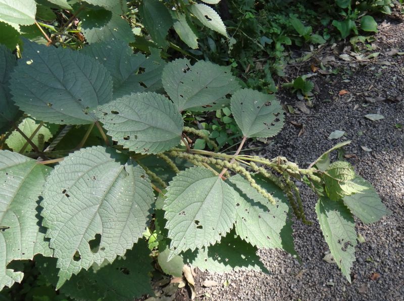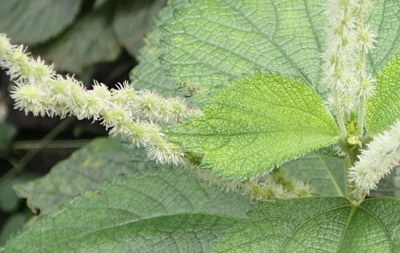 カラムシ :草、葉先は3裂せずに尾状にとがり、鋸歯20以上、雄花は総状につく。
