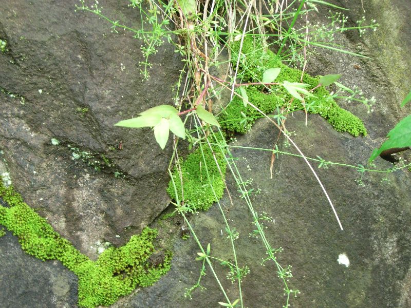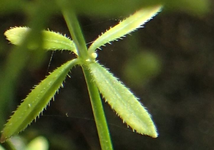 ヤエムグラ :茎の稜に棘、1〜3センチの広線形の葉が6〜8輪生、花4弁、果実に毛。