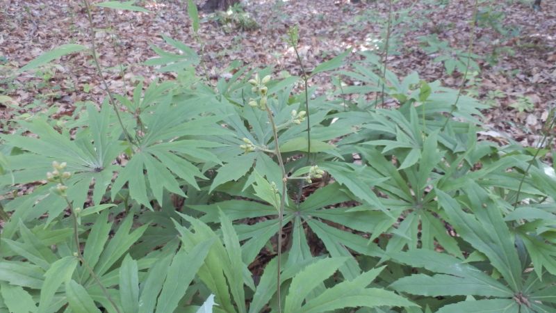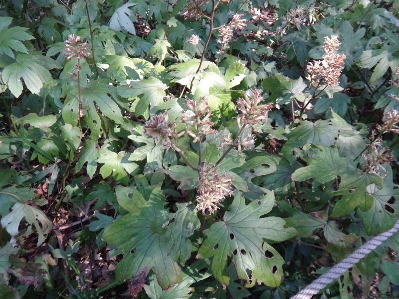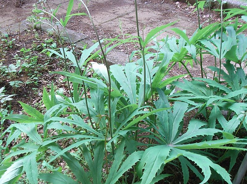 葉は直径35〜40センチの円形で掌状に7〜9深裂し、粗い鋸歯があり、