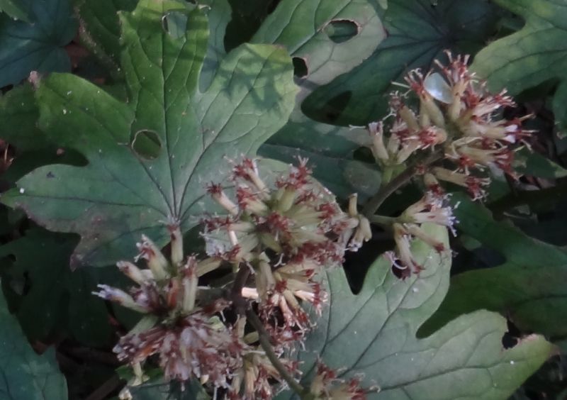 ヤブレガサ属、花は筒状花のみ、多年草。