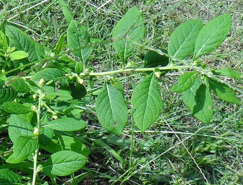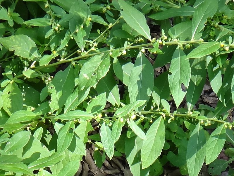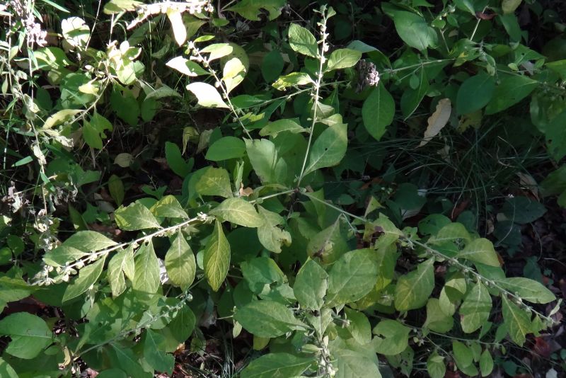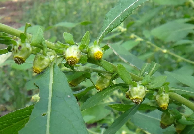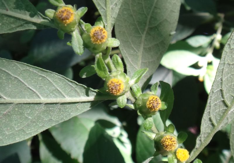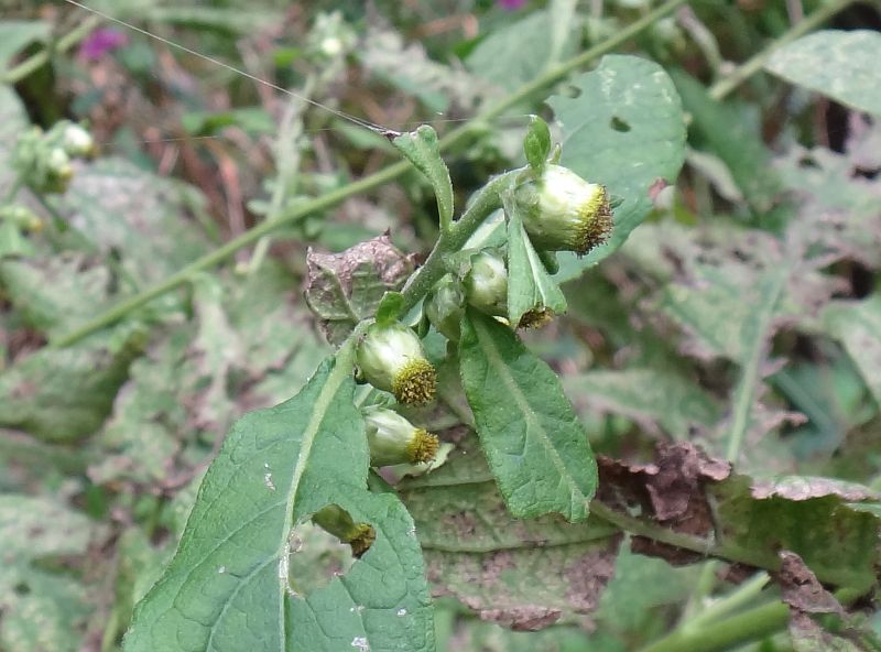 ヤブタバコ :上部の葉腋ごとに鐘形で黄色い頭花をつけ、花柄がほとんどない。
