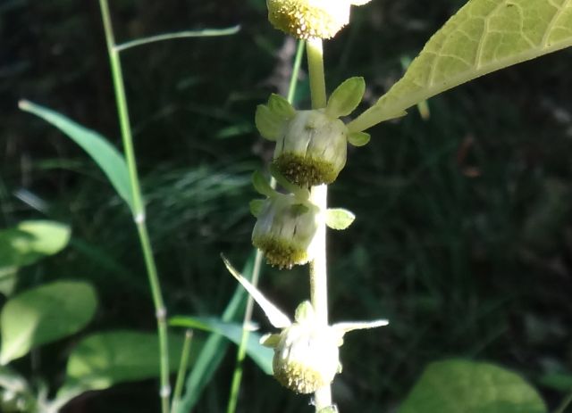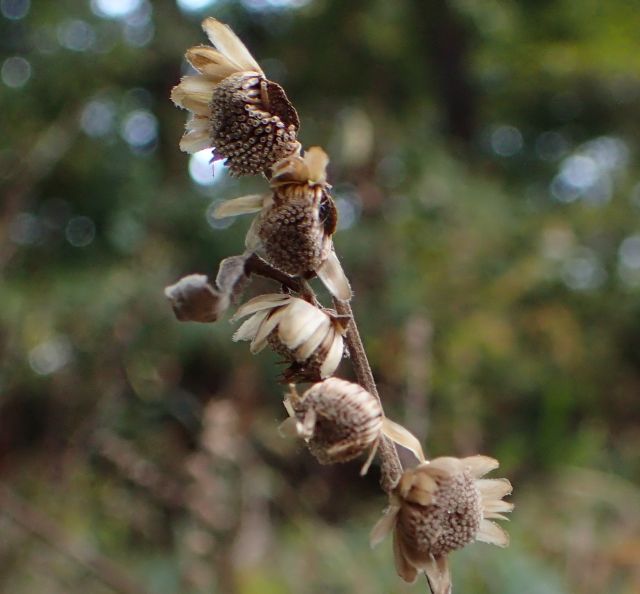コヤブタバコ:枝先に広鐘形で緑白色の頭花をつけ、その基部に線状被針形の苞葉が多数つく。