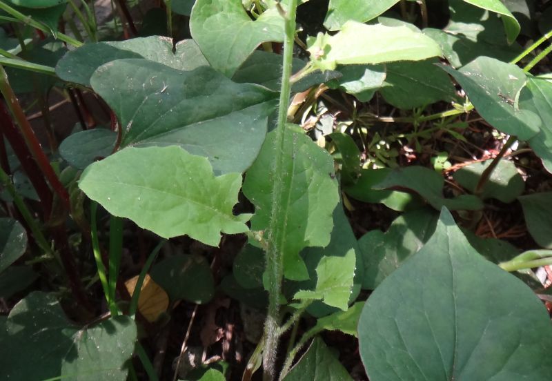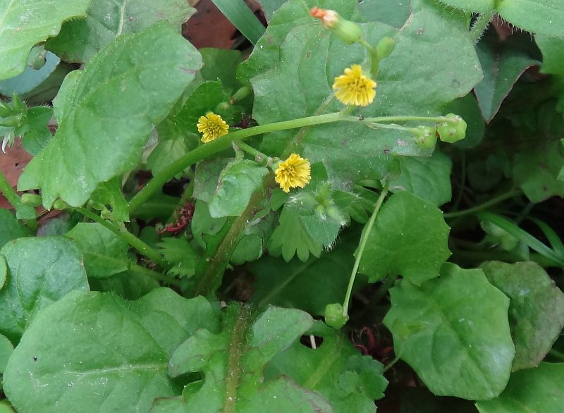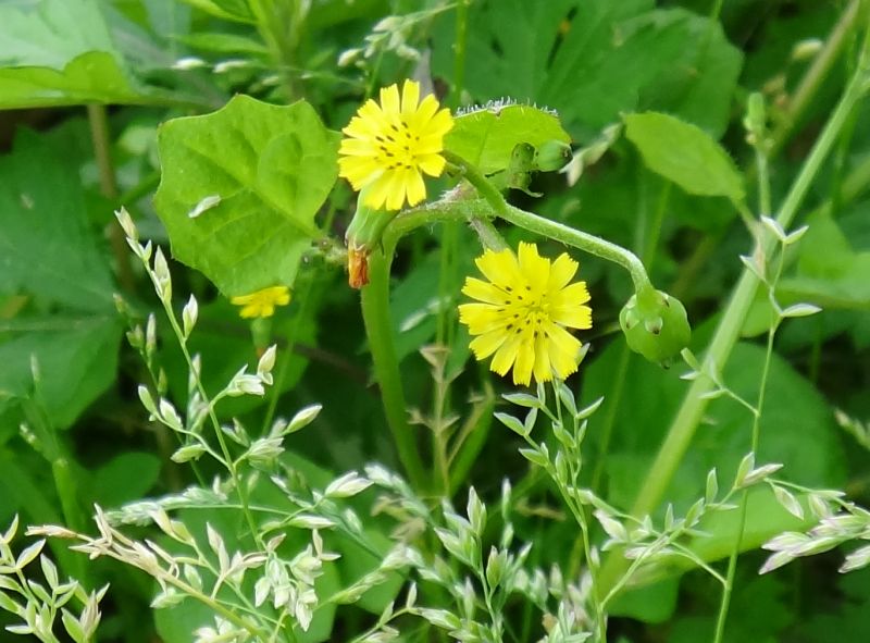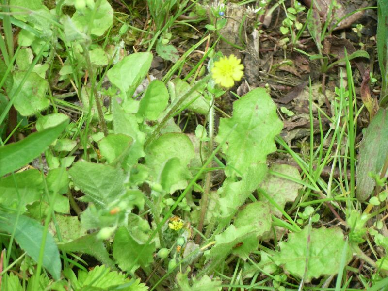 ヤブタビラコ :葉は丸みを帯び、茎は斜上ないし倒れて頭花を数個つけ、そう果の先に突起がない。舌状花は約20個。全体が柔らかで軟毛が多い。そう果に冠毛はない。