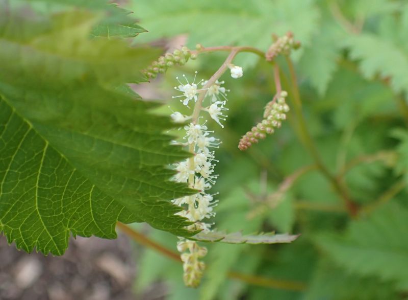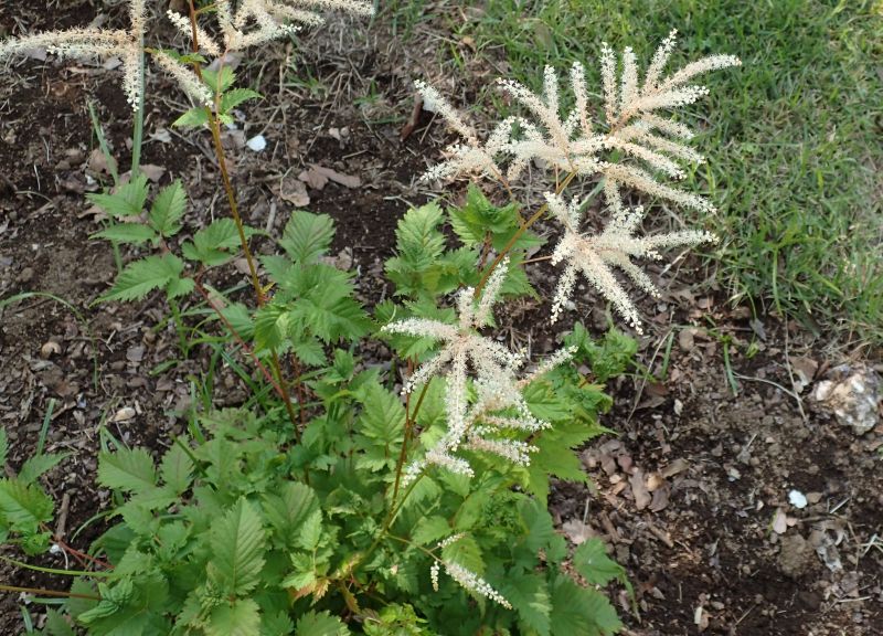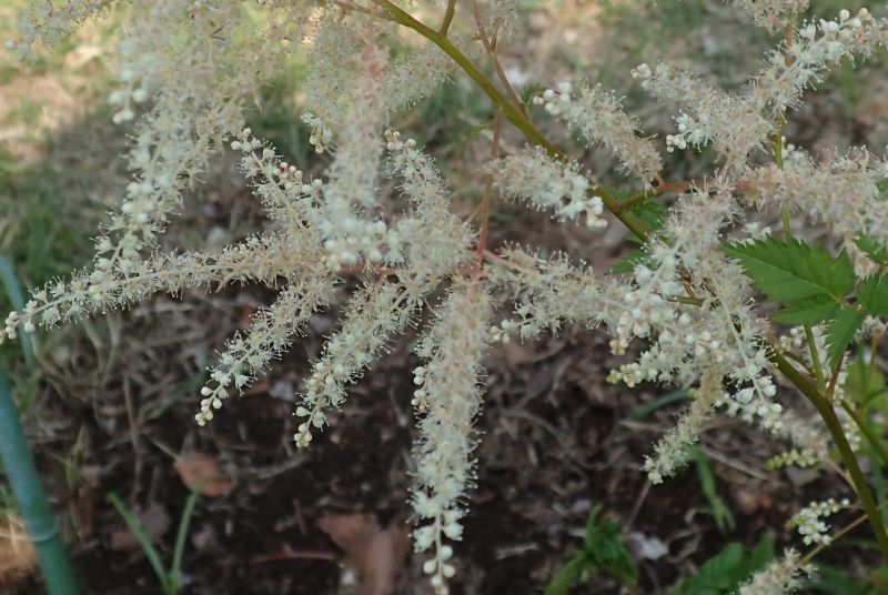 茎先に直立する円錐花序に白い小さい花が密集してつき、