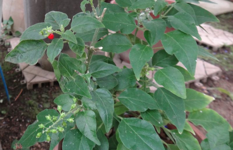 葉は尖った卵形か披針形で、白い花が咲き、 丸い液果が赤く実る