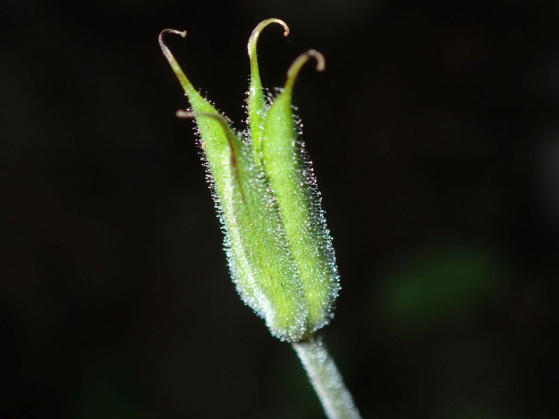 できつつある袋果。表面が毛に覆われ、距の先が曲がる。