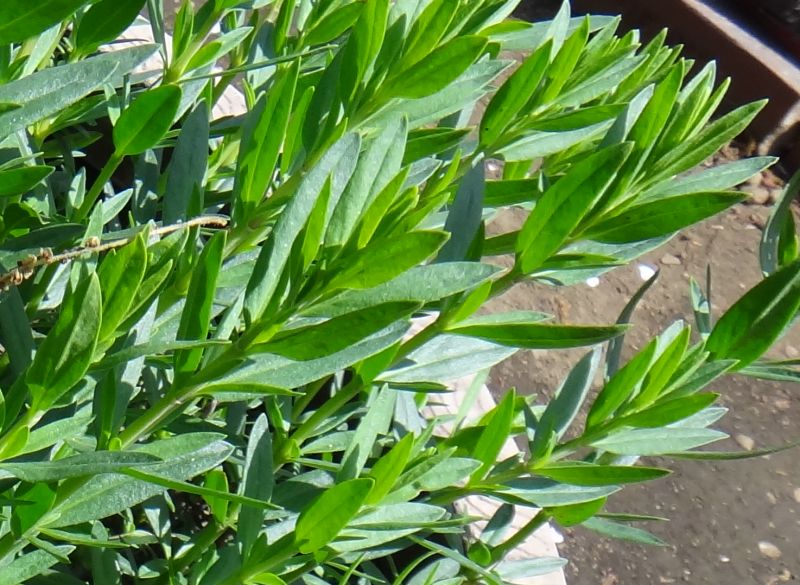 葉は長さ2〜4センチの線形でつやがあり、対生する。