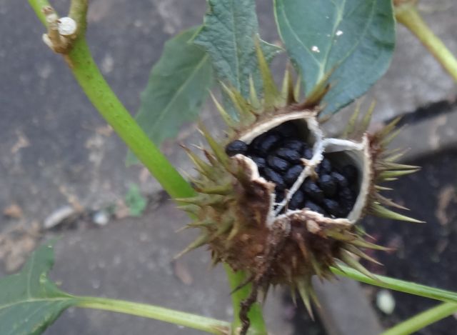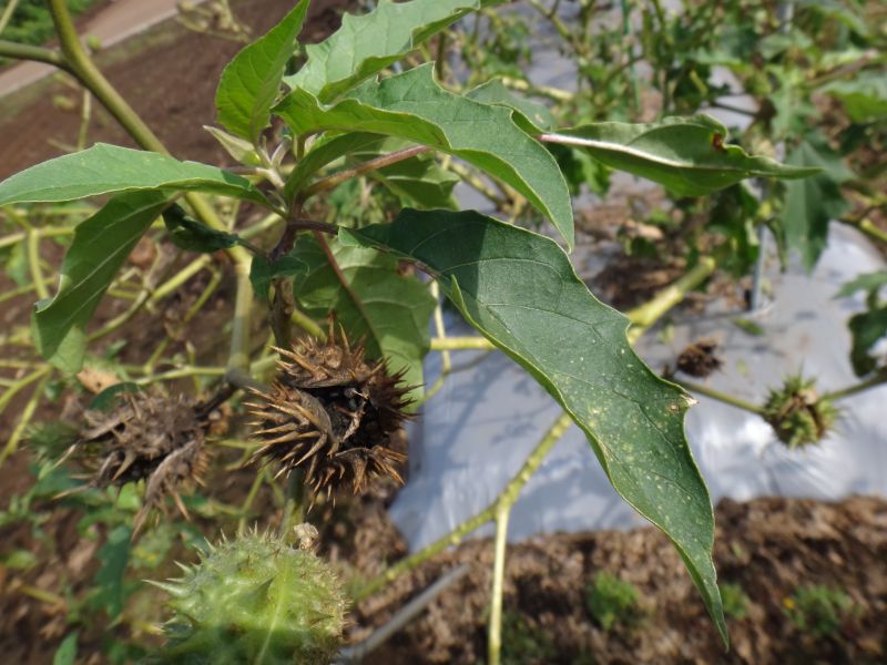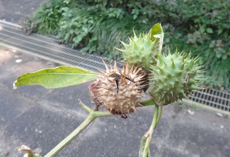 ヨウシュチョウセンアサガオ:果実卵形棘長い、種子黒、花約10センチ。