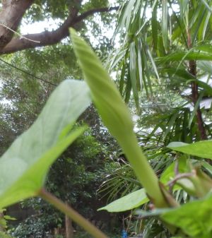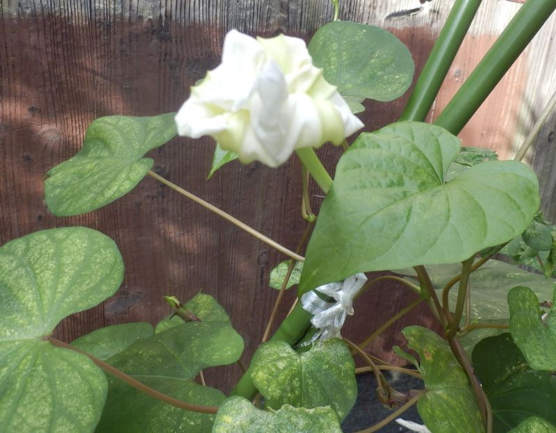 葉腋に花冠の5浅裂し白いた花が1個咲く。