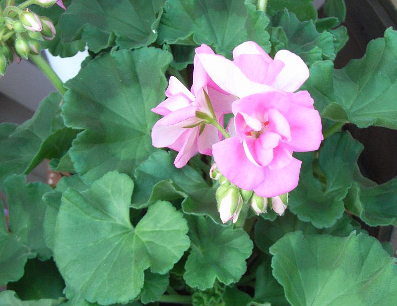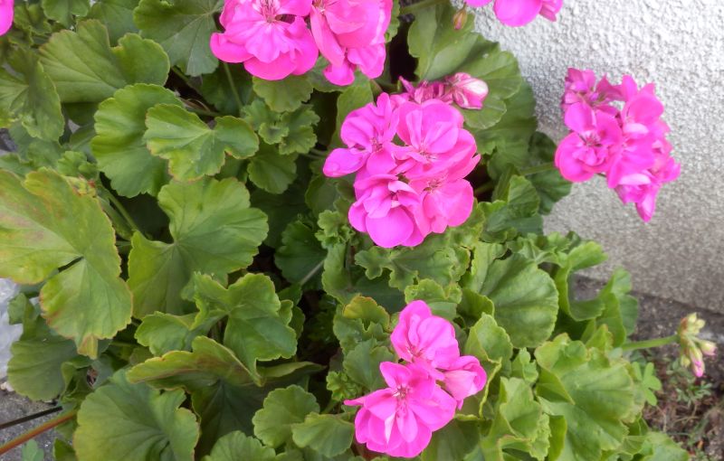ゼラニウム :葉は丸くて縁の切れ込み小、花期4〜11月、花は中、八重咲きあり。
