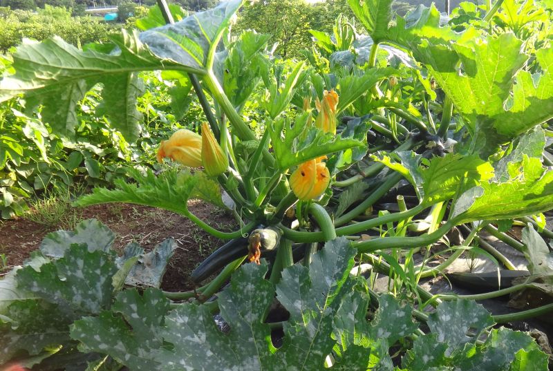 の仲間であるが、茎はごく短くてつるはなく、果実はキュウリのように細長い。