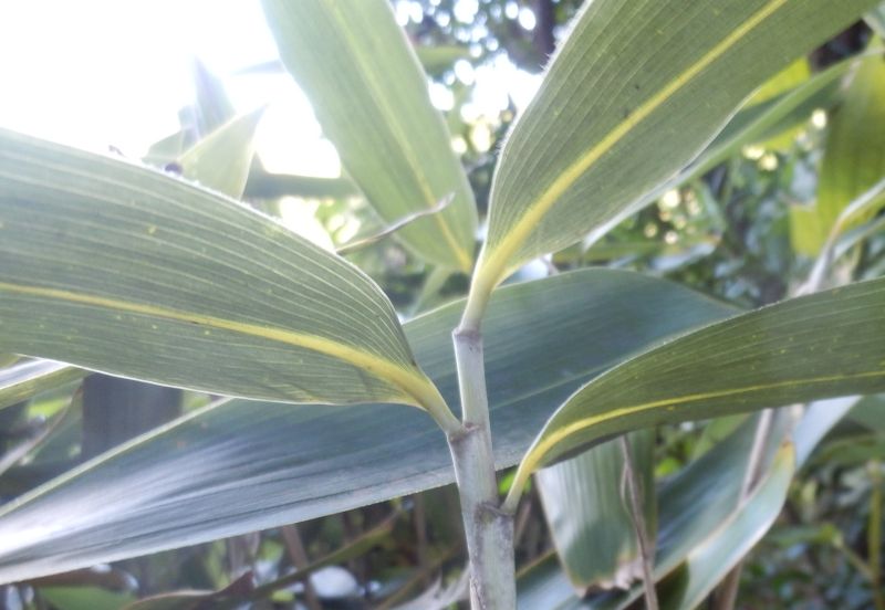 葉は革状紙質で、表裏ともに無毛であり、葉鞘も無毛である。