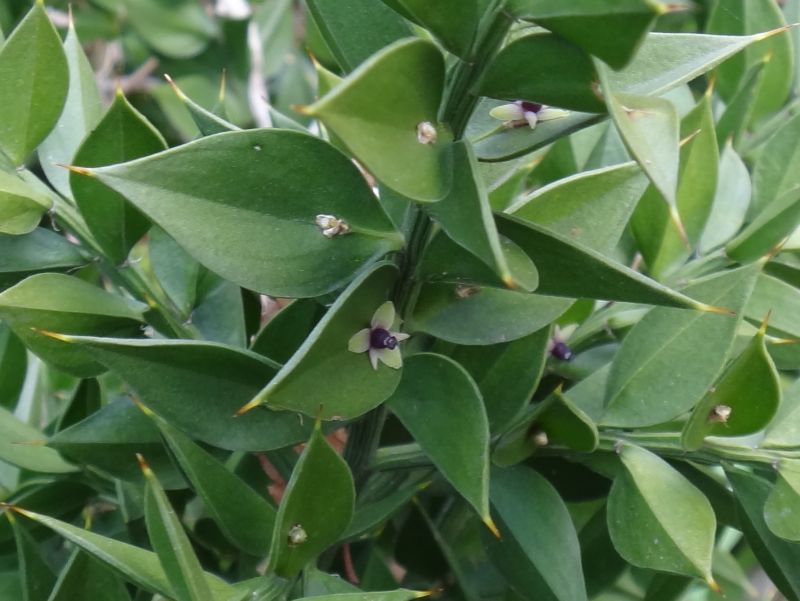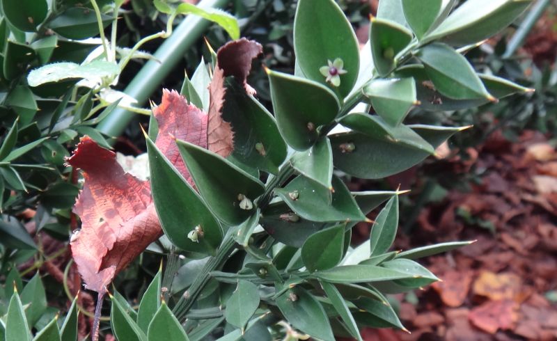 雌雄異株で、葉状枝の中央部に秋に蕾をつけ、