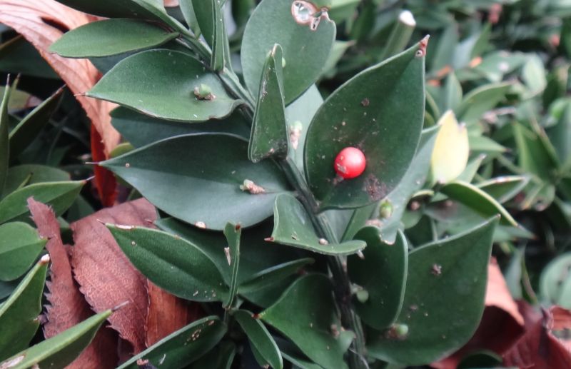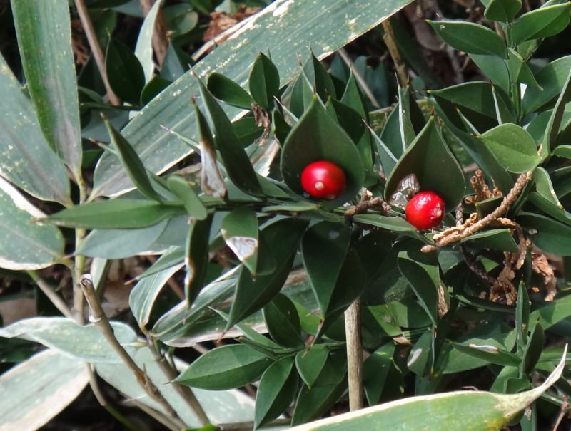 葉状枝の上に、直径1センチぐらいの球形の液果をつけ、