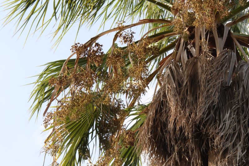 葉は幹の頂部分に群生し、直径約1.2メートルの掌状に深裂した円形で、