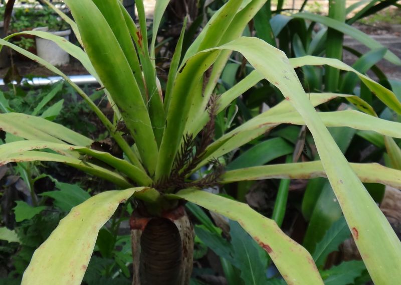 枝先に長さ40〜60センチで厚みのある剣状の葉が束生する。