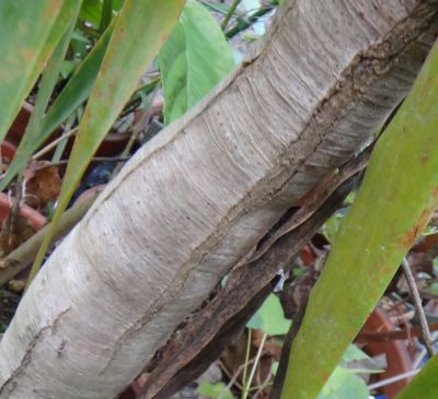 幹は灰褐色で、はじめは普通の木のように直立しているが、