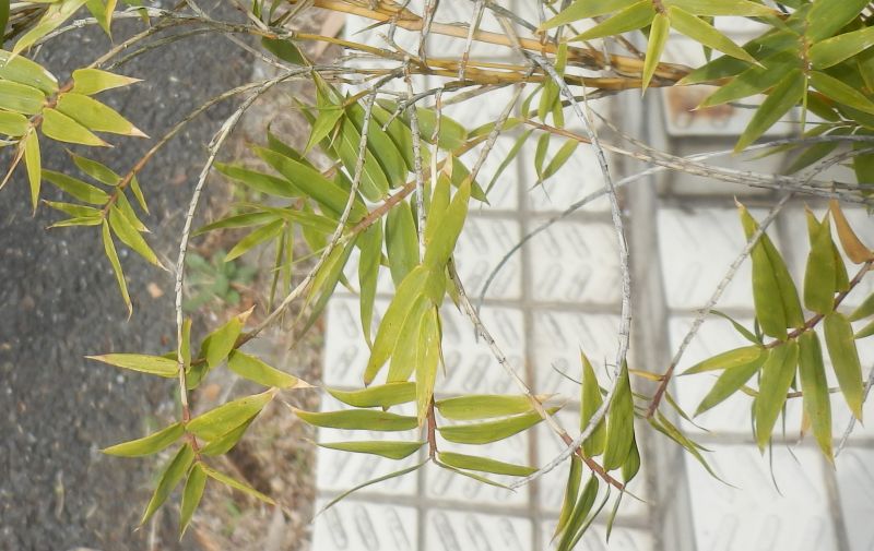 披針形の葉が互生状に左右に広がる。