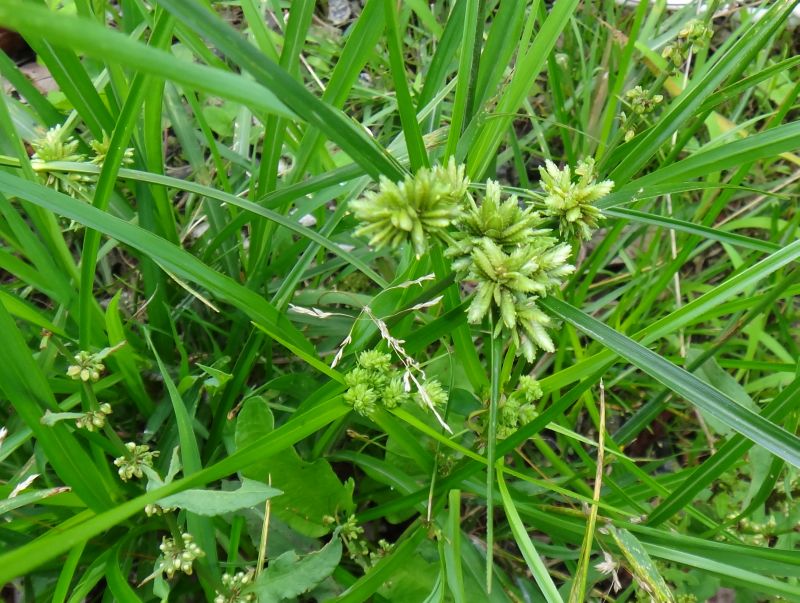 その中央に緑色の小穂が直径1.5〜2.5センチの頭状に集まってつく。
