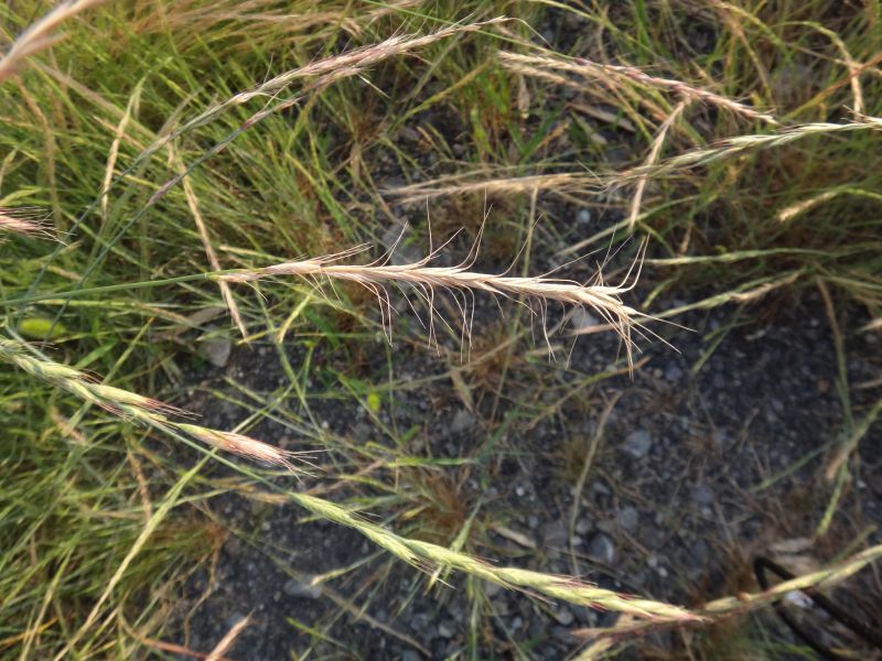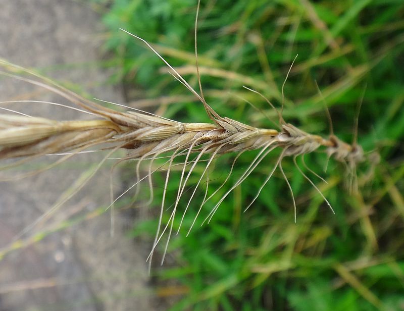 アオカモジグサ:花穂は緑色、穂のばらけ・下垂少なく、内穎が外穎より短く、花後の芒が反り返る。