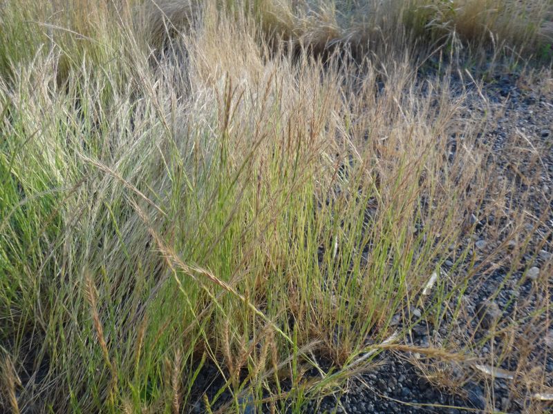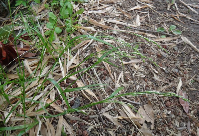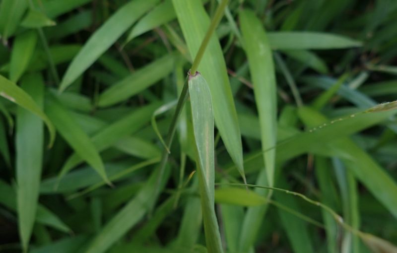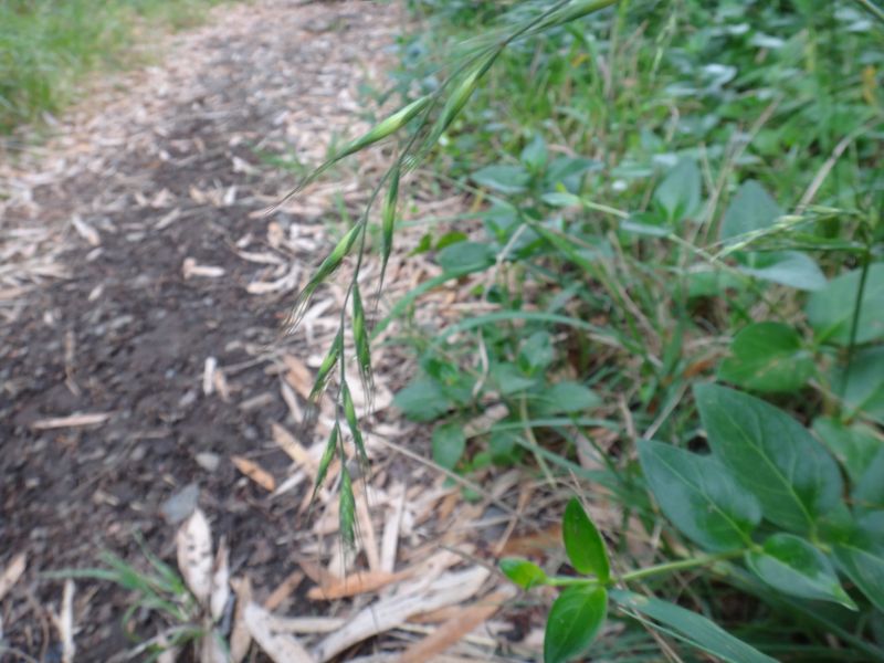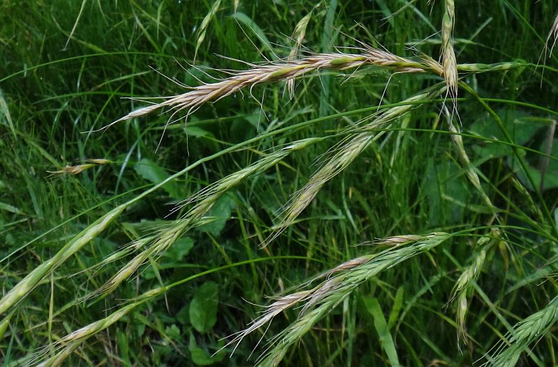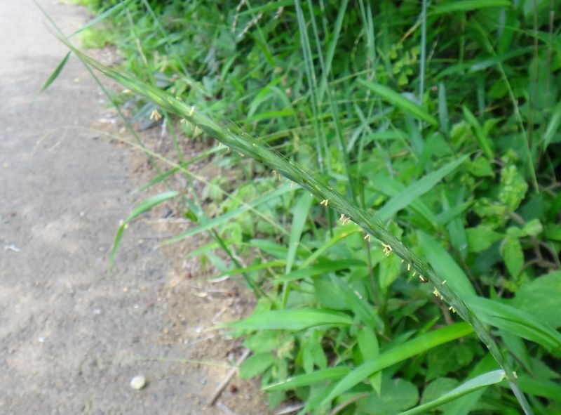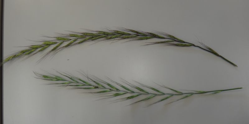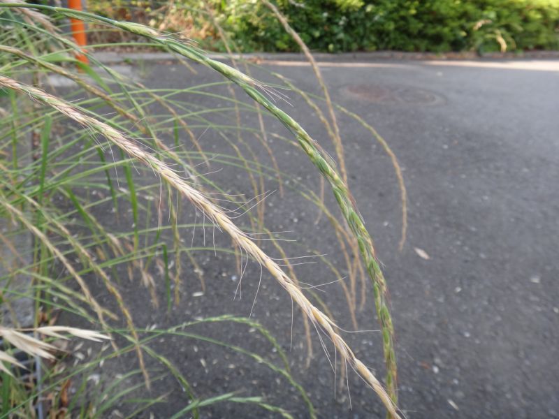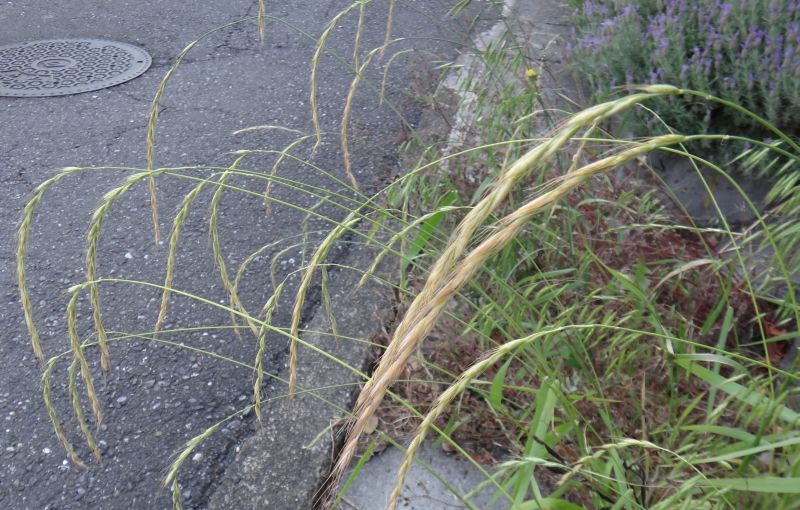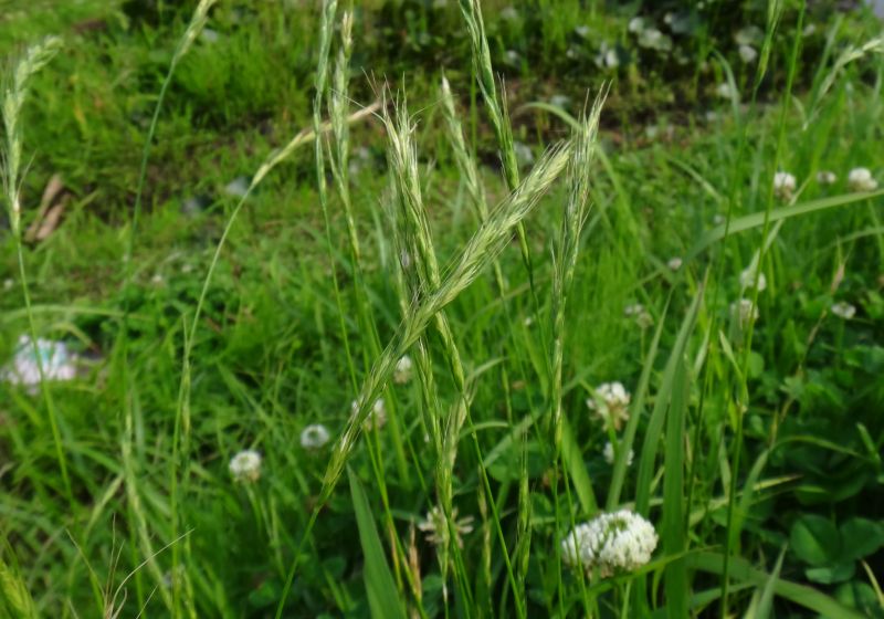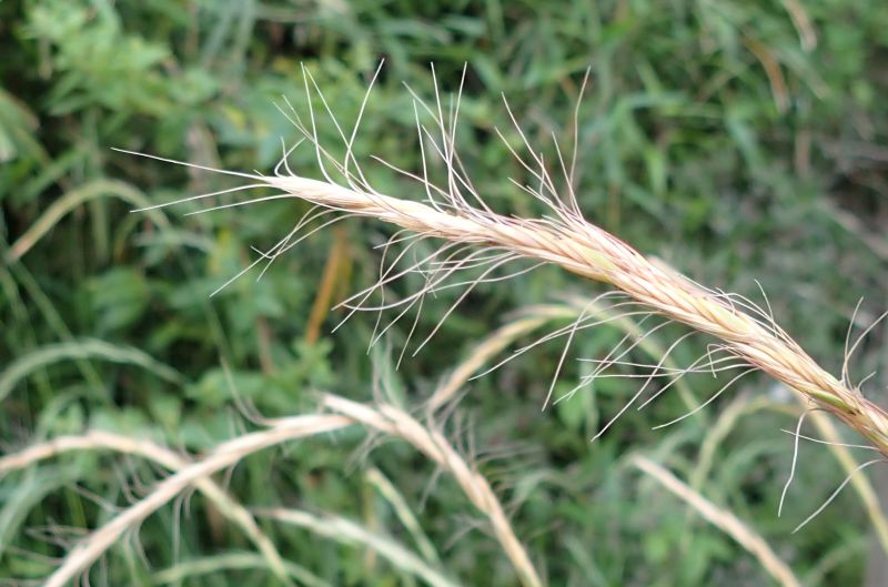 ヤマカモジグサ:葉が途中で反転、花穂は緑色、小穂に短い柄、穂のばらけ・下垂少なく、内穎が外穎より短い。