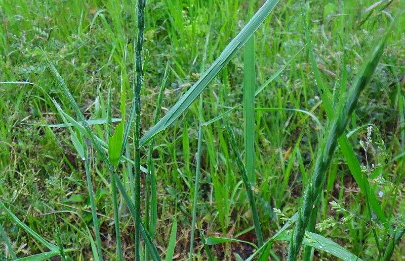 ミズタカモジグサ:湿地に生え、花茎が太くて直立し、芒は帯紫色、穂はばらけない。