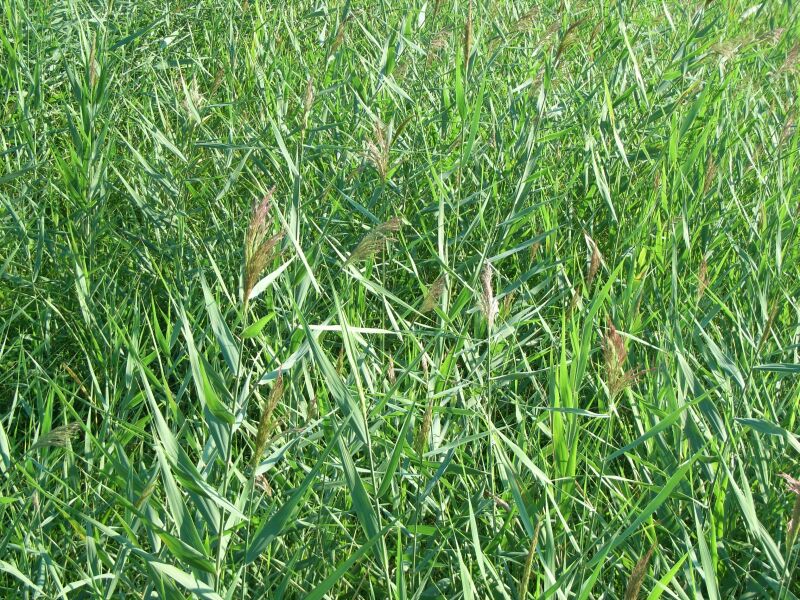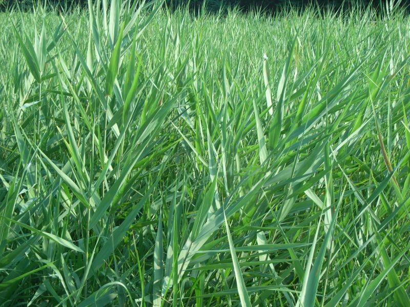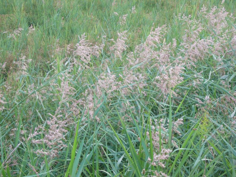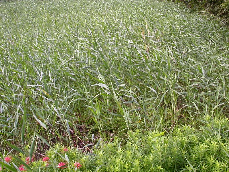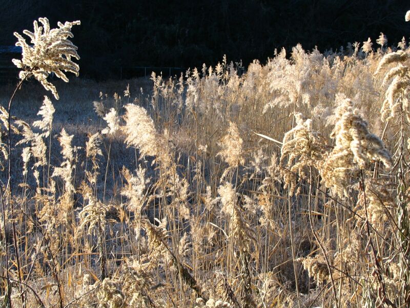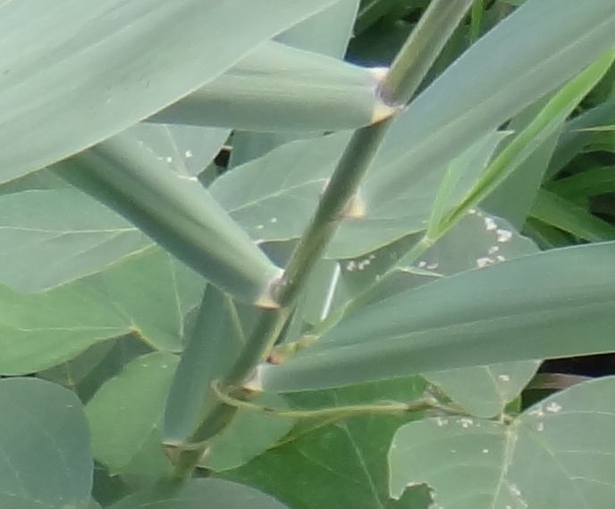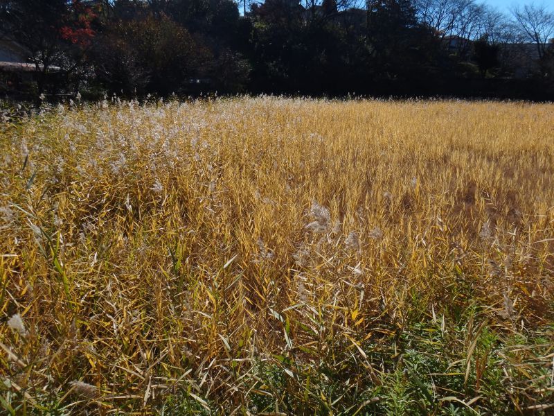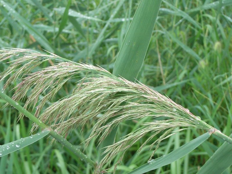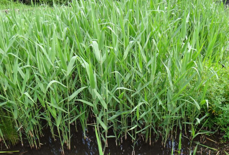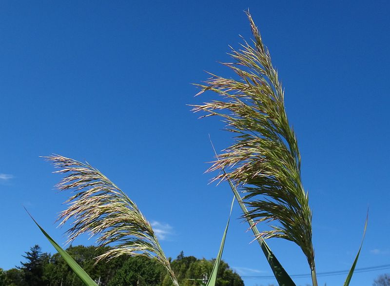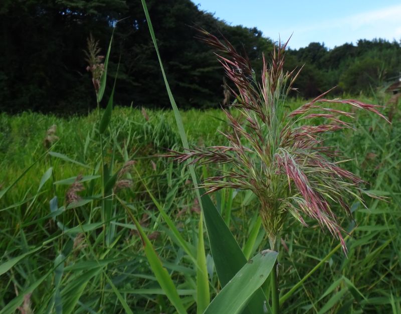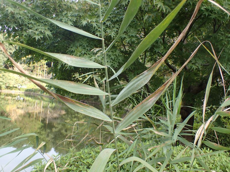 アシ :湿地、丈1.5〜3米、根茎地中を走り、疎に群生、葉は幅広で斜上、中脈目立たず、葉鞘は薄緑、。