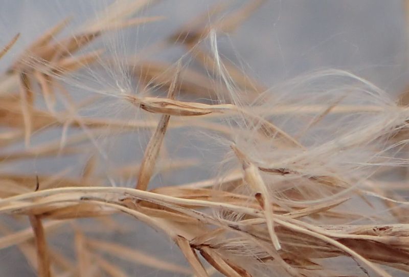細長い楕円形の種子の頭に、風で飛ぶための絹毛がついている。