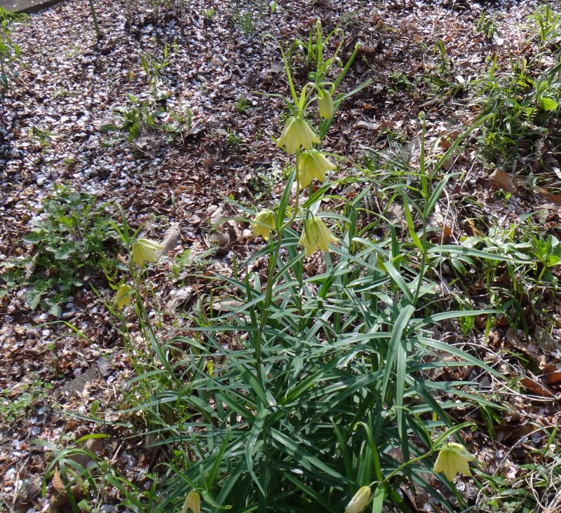 長さ3センチぐらいの淡緑色の釣鐘状の花を下向きに数輪咲かせる。