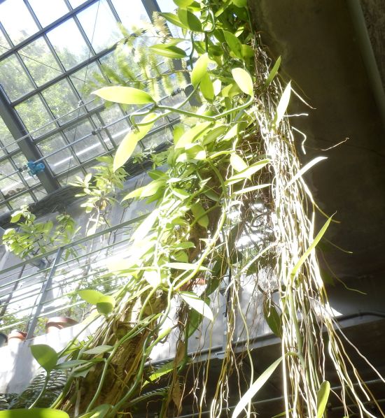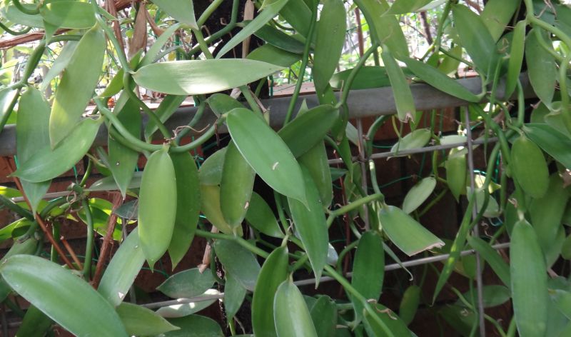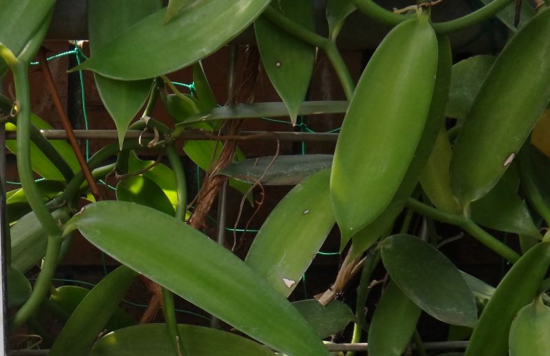 うまく受粉できると、30センチ近くのマメの鞘のような細長い果実ができ、