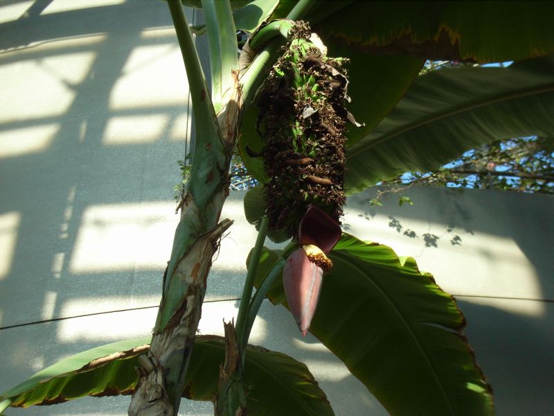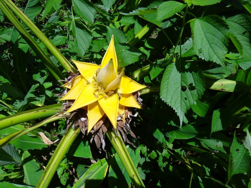 葉はバショウに似ており、 黄色い砲弾形の花序の苞が外側から剥がれるごとに花が現れる