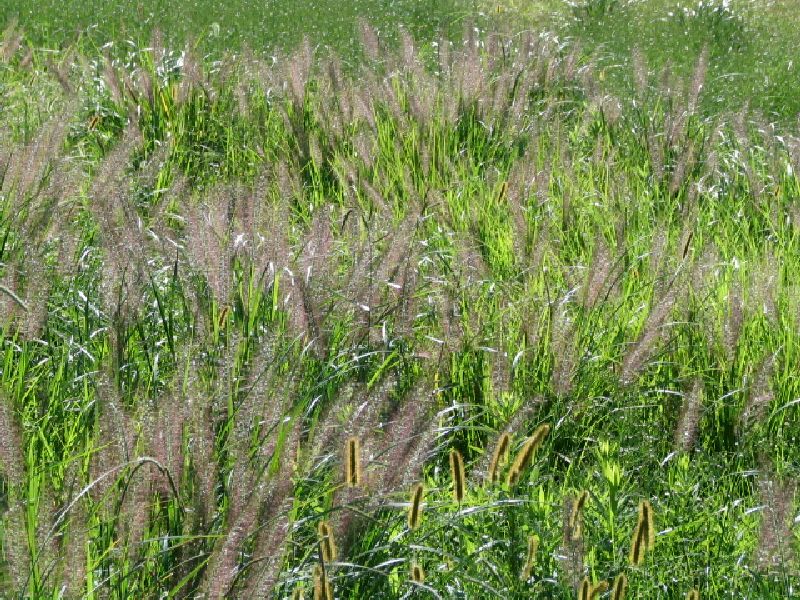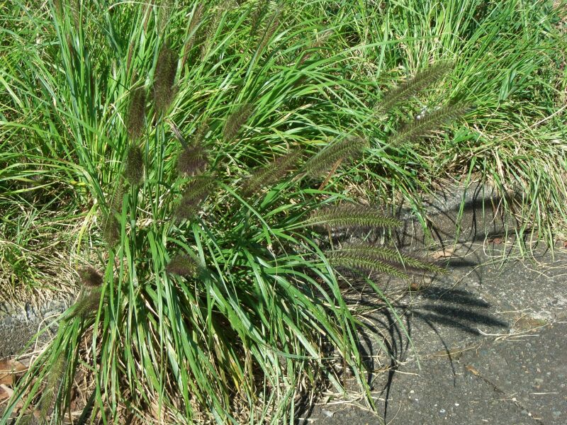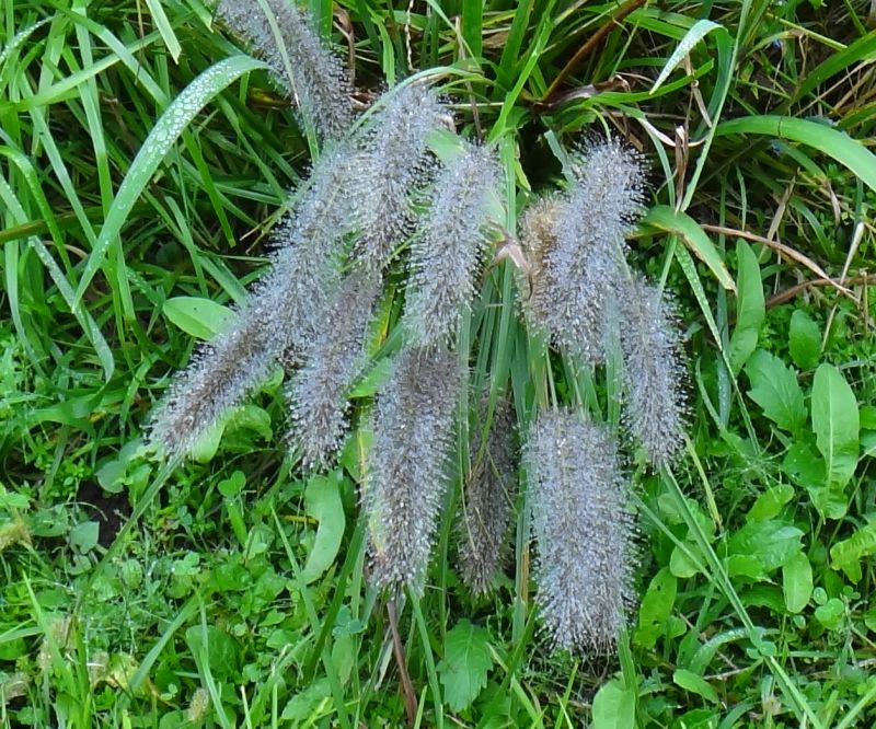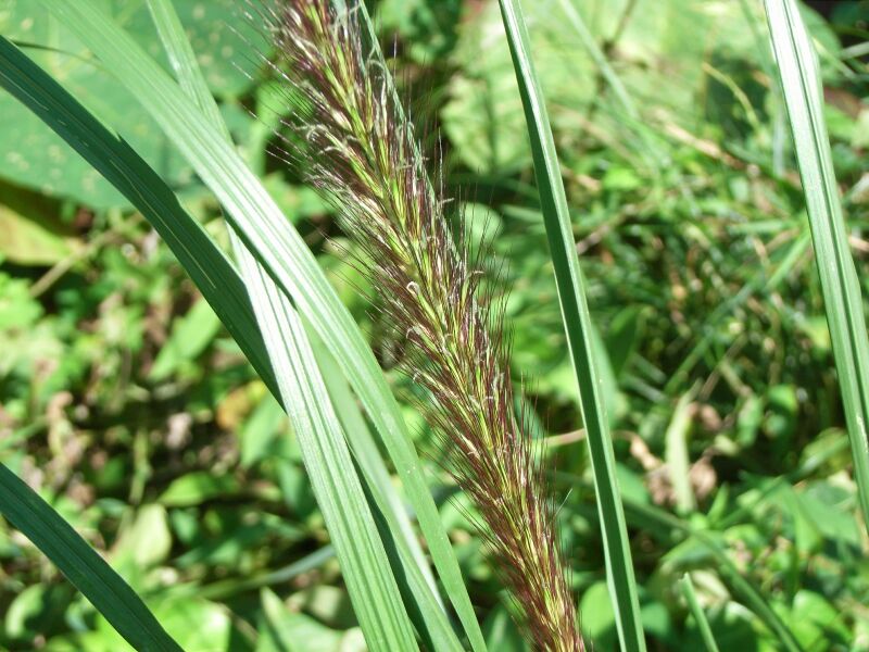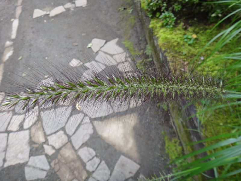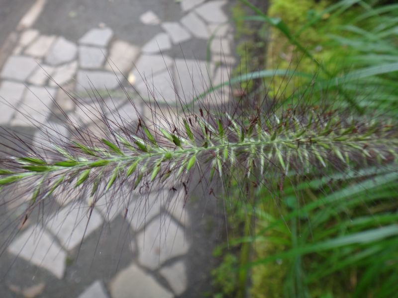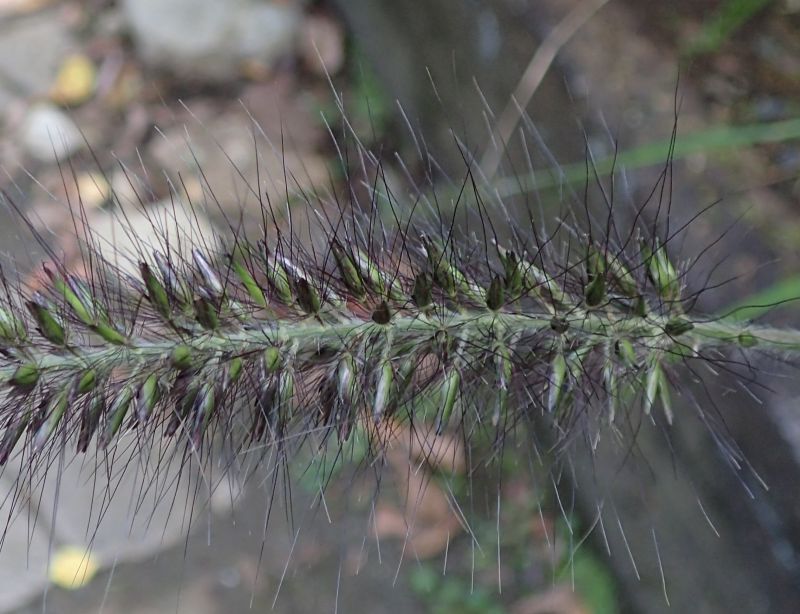 直立させ、暗紫色の剛毛の生えた小穂を多数つける。