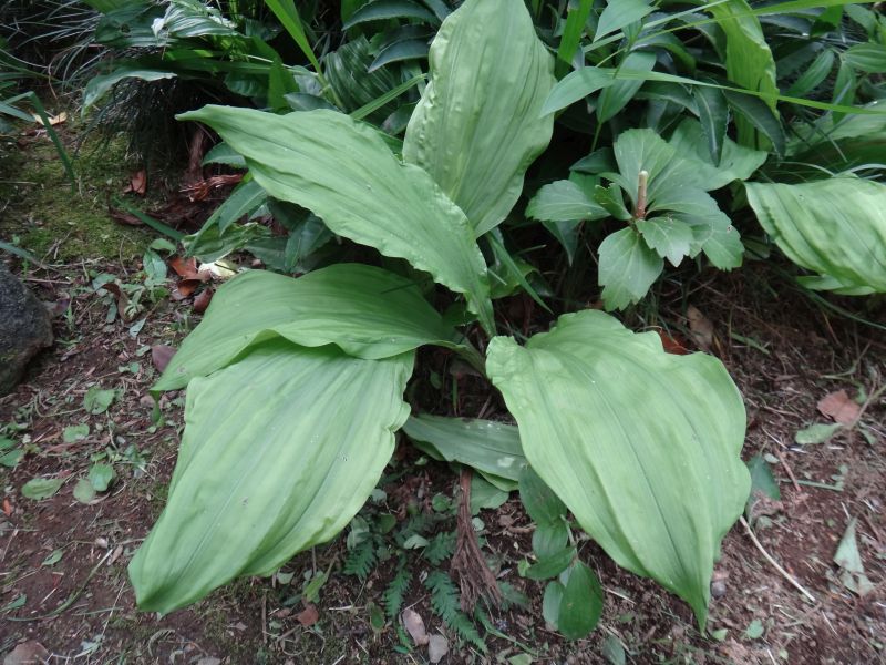 林内に生え、茎は短いが基部が肥大して球茎(偽鱗茎)となり、