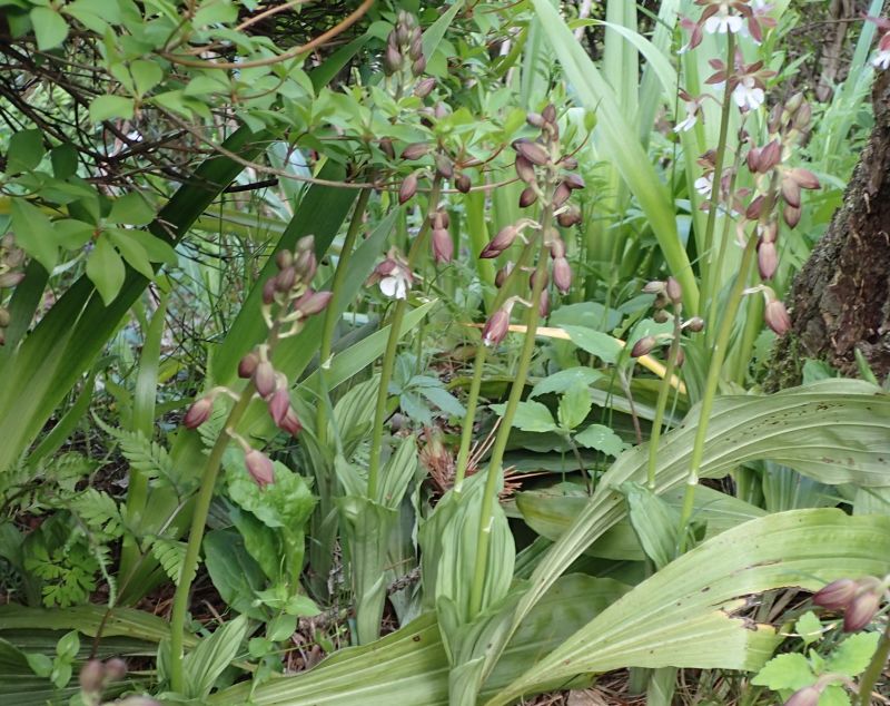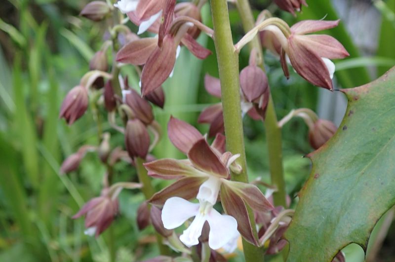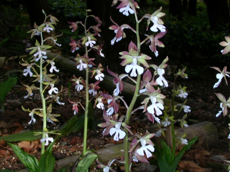 花は萼が茶色で唇弁が白色のものが多いが、色については