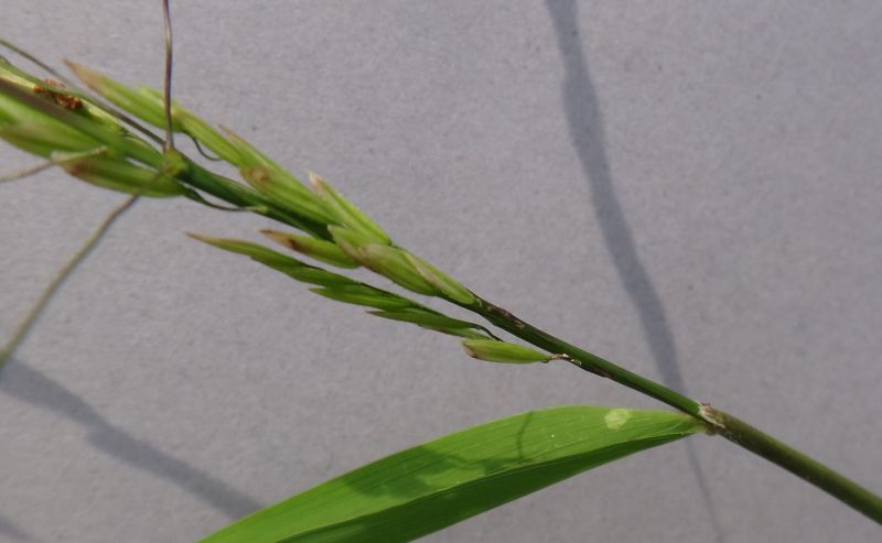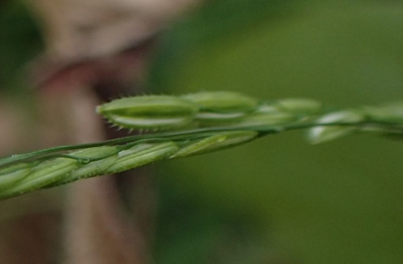 小穂が花序枝に直線状にならび、小穂が6〜8ミリと長く、剛毛が少ない。