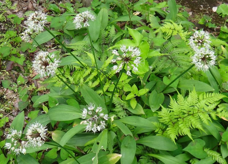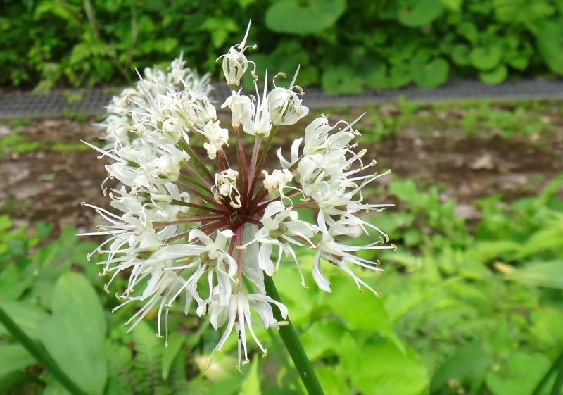夏に花茎が立上り、茎先に淡黄白色の6弁花を多数散形状につける。