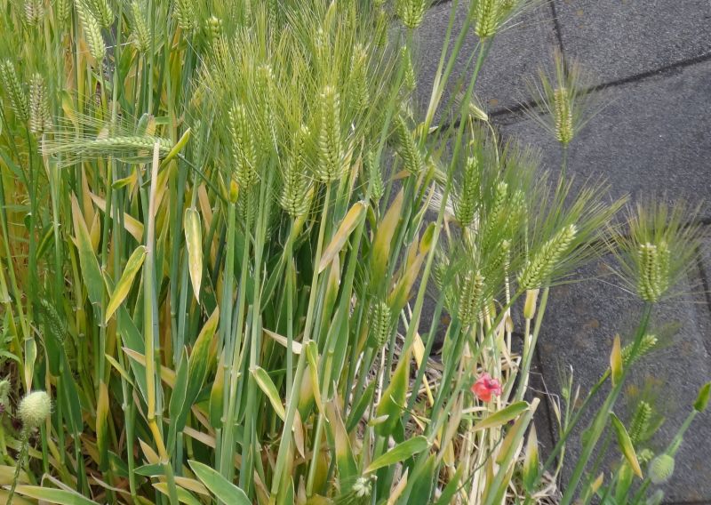 コムギ :穂を上から見ると種子が4角形に並ぶ、芒は長くない。