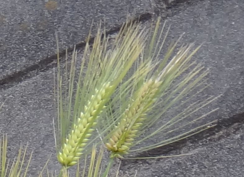 オオムギ :穂を上から見ると種子が6角形に並ぶ、芒が長い、もむだけでは皮がとれない。