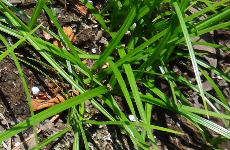葉は幅2〜6ミリの線形で光沢があり、根から出る。断面は浅いM字形となる。