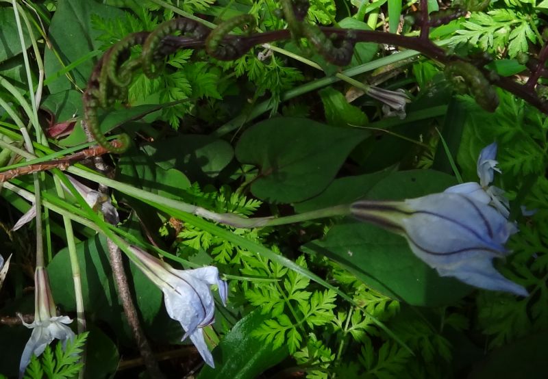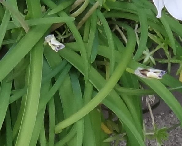 その先に6弁の白っぽい薄紫色の花を1個平開させる。