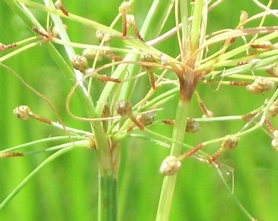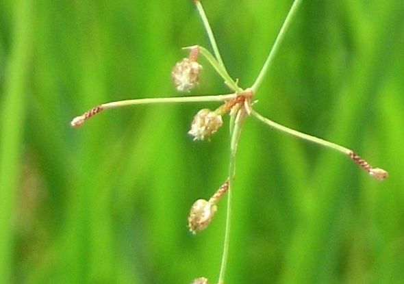 赤褐色で球形の小穂を集散状に多数つける。