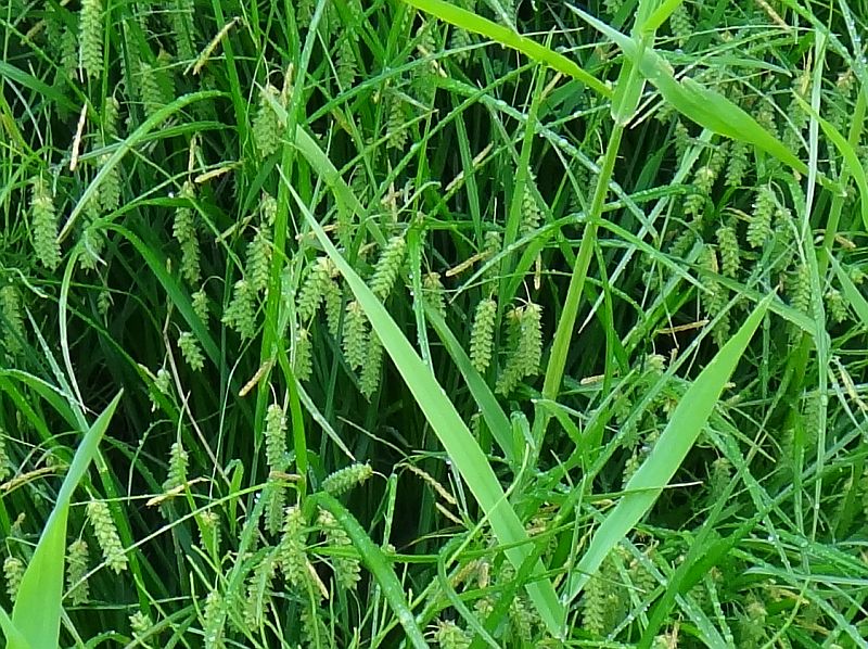 直立する花茎の上部に細い柄のついた小穂を2〜4個つける。