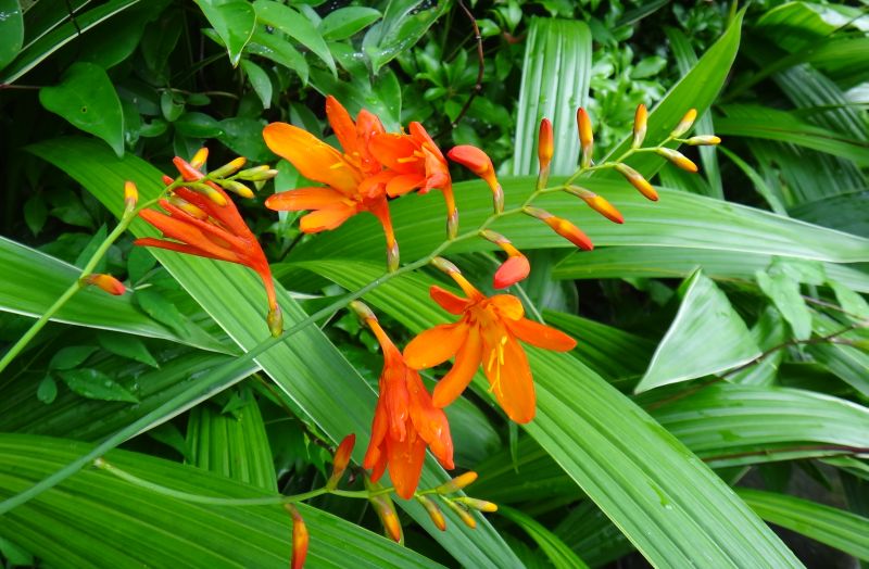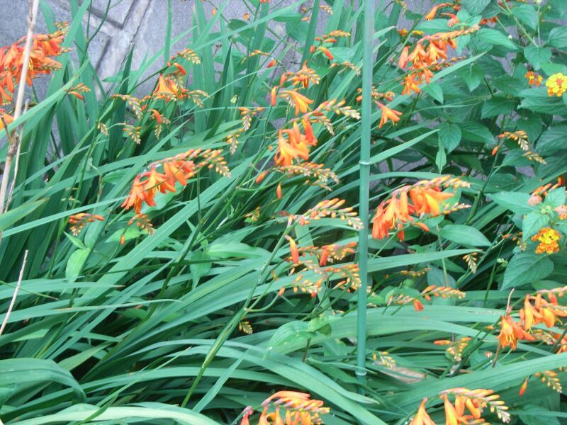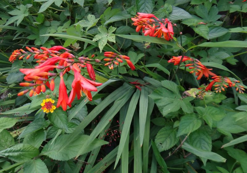総状花序に朱赤色の長さ2〜3センチの6弁花を下から上へと順次咲かせる。