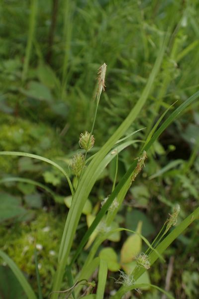 果胞がややまばらに並び、基部の苞は赤褐色の鞘状に退化している。