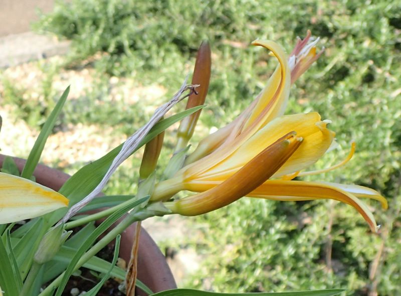 トウカンゾウ:常緑、黄橙、一重、5〜7月、朝咲く。