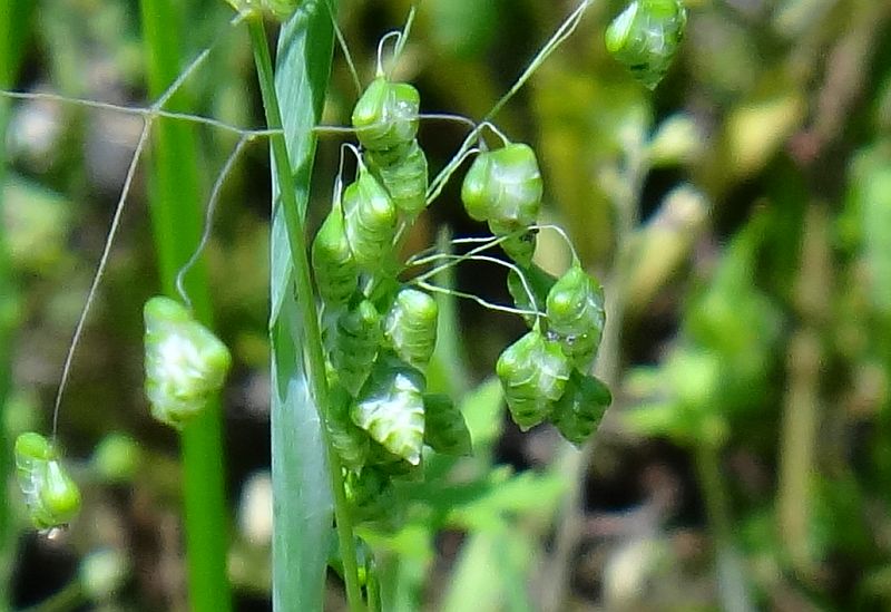 分岐した細い糸状の柄の先に垂れ下がる。芒はない。