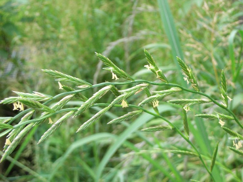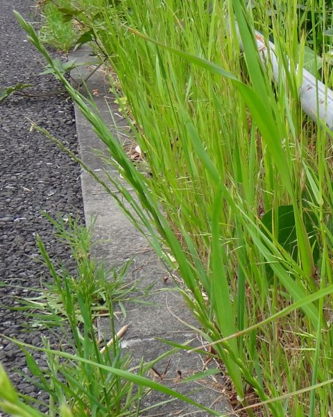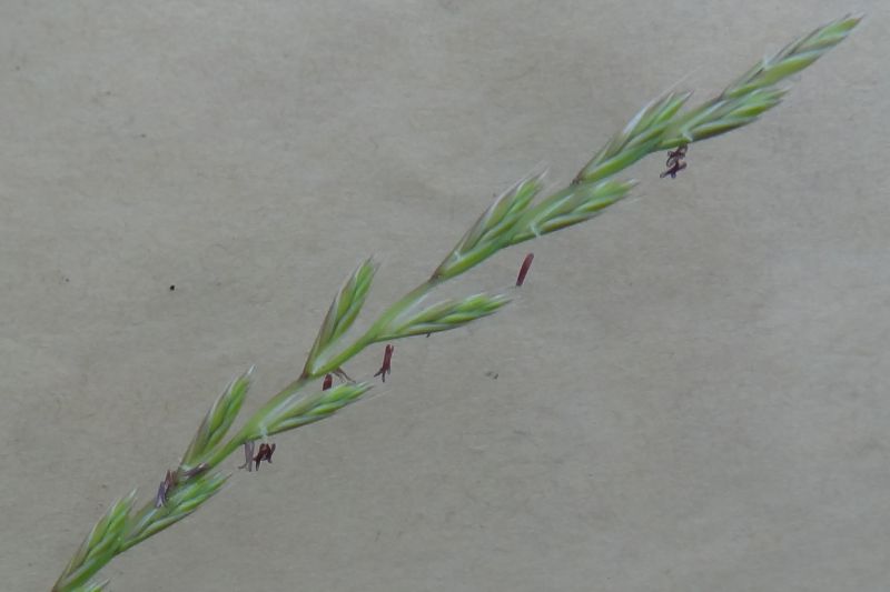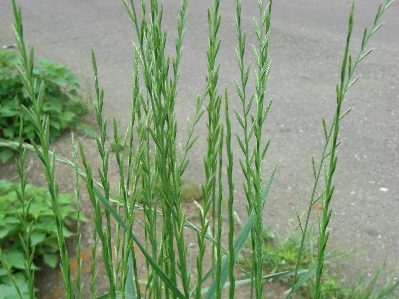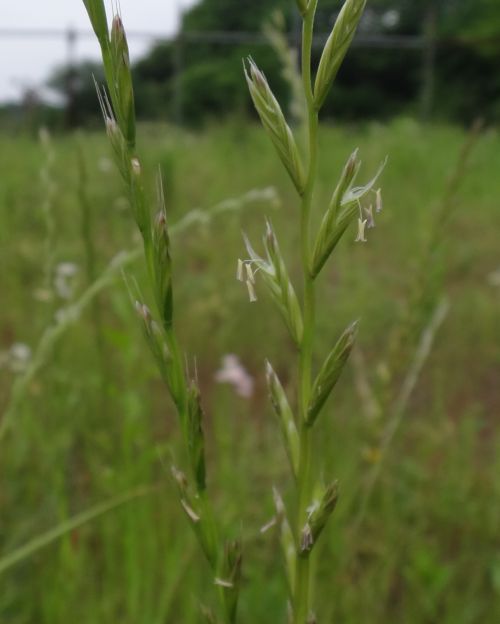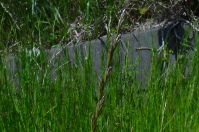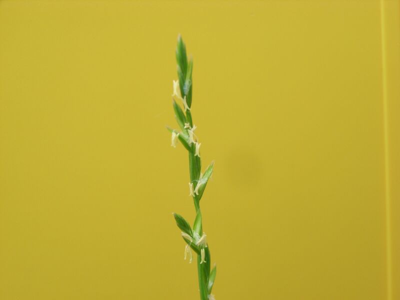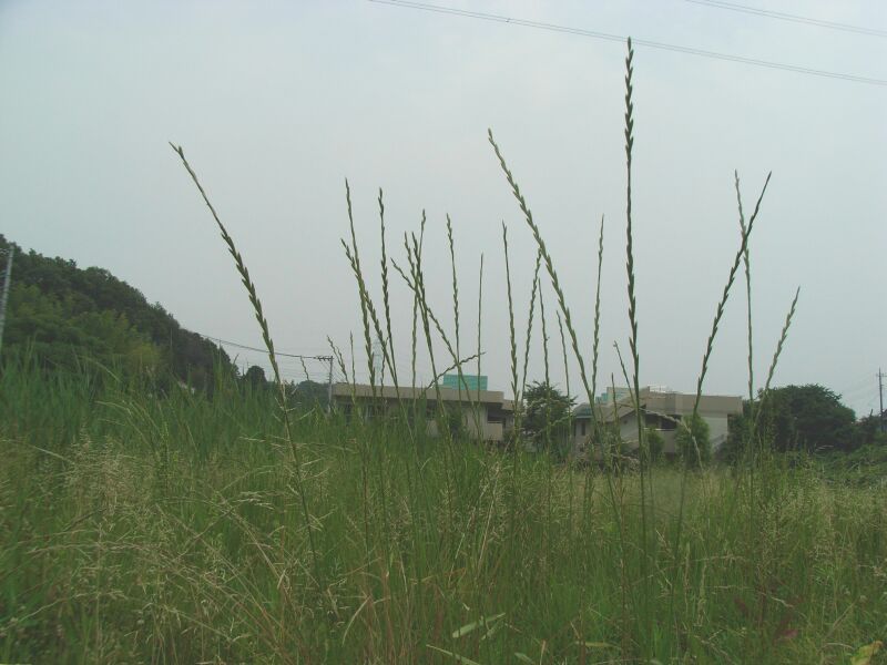 ホソムギ :多年草、葉幅2〜4ミリ、葉耳不明瞭、芒は無または微、小花6〜14個。