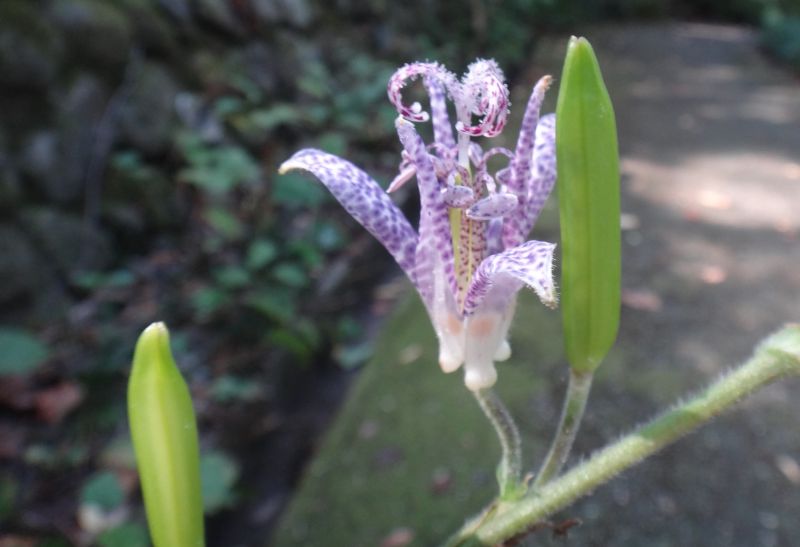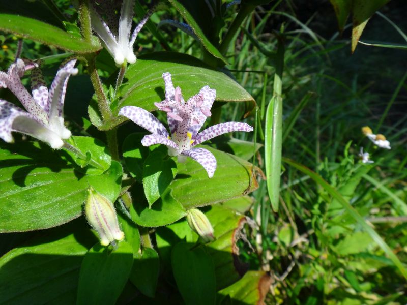 タイワンホトトギス:花被片斜上、紅紫色斑点多数。茎先に散房状に咲く。