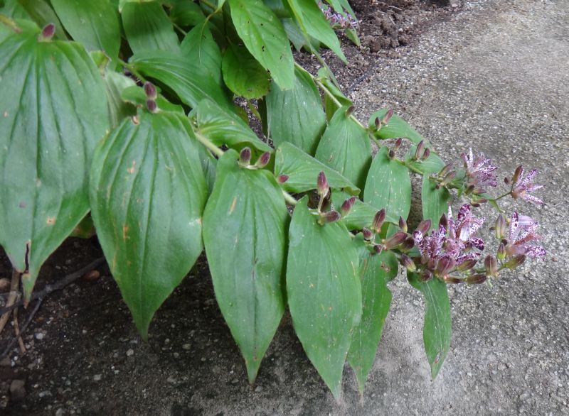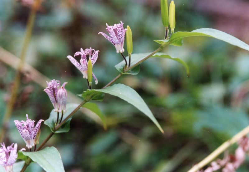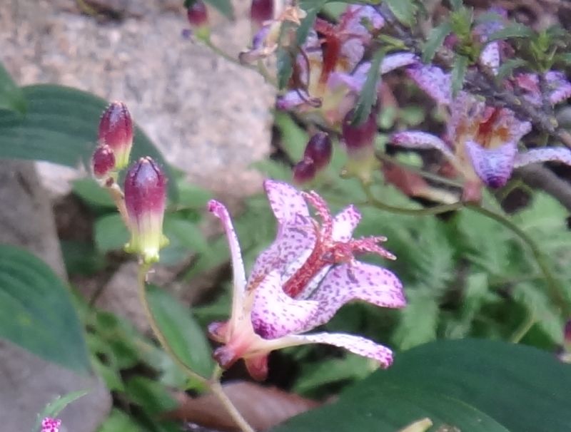 ホトトギス :花被片斜上、紅紫色斑点多数。葉腋に2〜3個ずつ咲く。