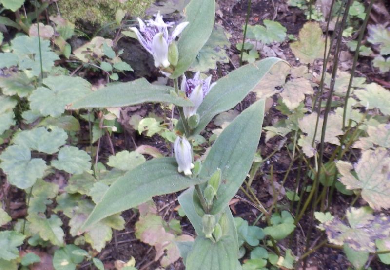 ヤマジノホトトギス:花被片上半部平開、紅紫色斑点やや少ない。茎先や葉腋に1〜3個ずつ咲く。